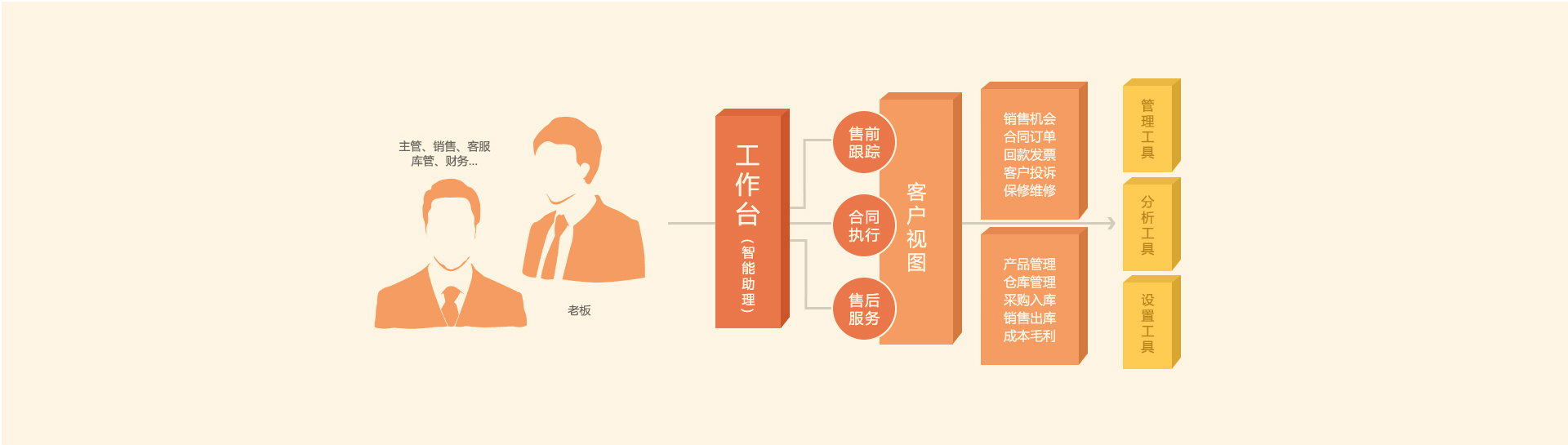 紧随用户需求,打破信息孤岛,实现市场、 客户、销售(产品进销存)、帐务、服务等流程一体化。
