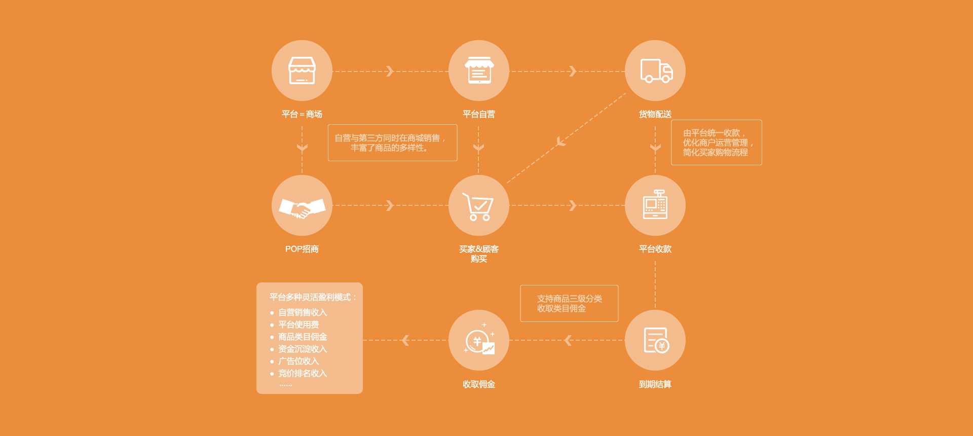为有平台梦的企业,打造店中店+生态化的互联网商业圈, 满足多用户形态,打通上下游供应链